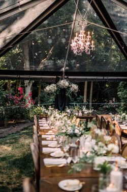 The centerpiece was our spectacular clear-top tenting. The CANOPY 30X60 JT CLEAR BLACK TRIM and CANOPY 20X20 JT CLEAR BLACK TRIM allowed the forest canopy and starry night sky to become part of the décor, creating an unparalleled atmosphere. Luminous light elements enhanced the glow: